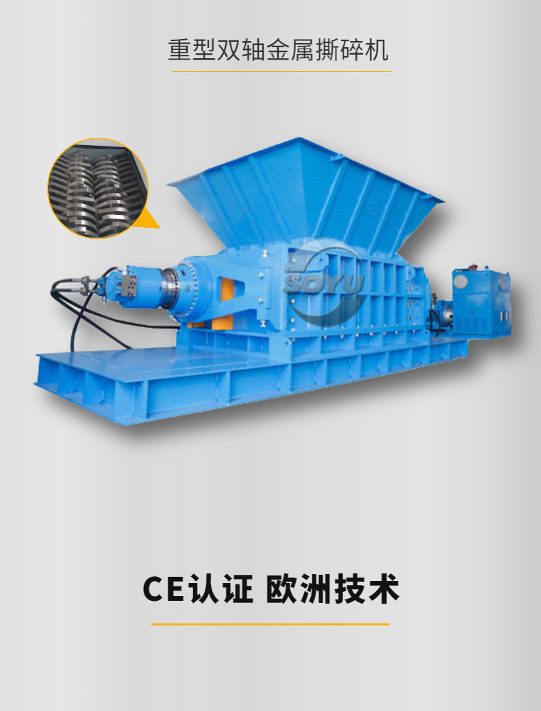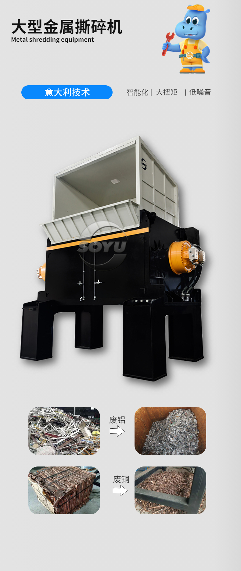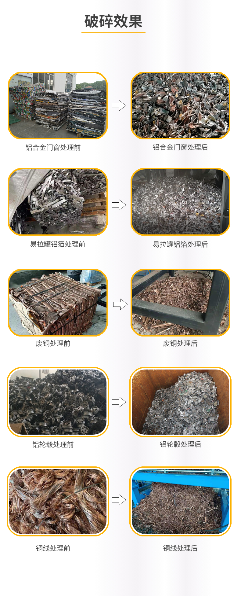 本機采用行星齒輪減速機驅動,刀片采用高強度合金鋼制成,有較強的耐磨性和較高的強度等特點,軸之間差速運轉,有撕扯、擠壓、咬合等功能。電氣部分采用西門子電氣元件編程控制,具有自動檢測過載保護等功能。專為破碎各種鋁型材及輕薄金屬物料設計,適合各種大體積,難破碎的壓塊的或散件的鋁型材物料細化,具有出料均勻、大小可控等優點,適合撕碎的物料有:打包鋁、鋁泊、鋁材、鋁條、輕薄鋼料、輕薄鐵料等各種廢金屬物料。效率高、低轉速、大轉矩、低噪音