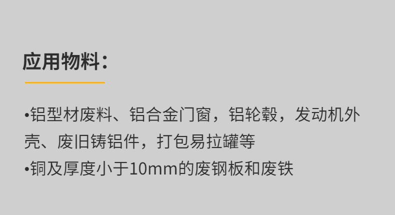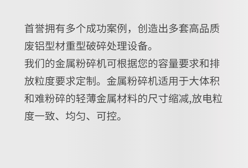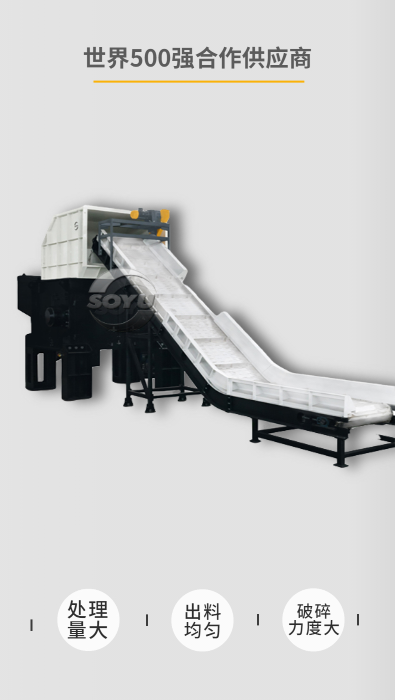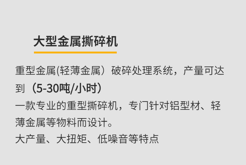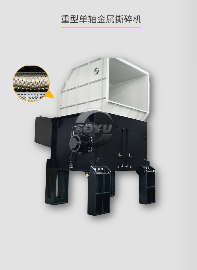 本機采用行星齒輪減速機驅動,刀片采用高強度合金鋼制成,有較強的耐磨性和較高的強度等特點,軸之間差速運轉,有撕扯、擠壓、咬合等功能。電氣部分采用西門子電氣元件編程控制,具有自動檢測過載保護等功能。專為破碎各種鋁型材及輕薄金屬物料設計,適合各種大體積,難破碎的壓塊的或散件的鋁型材物料細化,具有出料均勻、大小可控等優點,適合撕碎的物料有:打包鋁、鋁泊、鋁材、鋁條、輕薄鋼料、輕薄鐵料等各種廢金屬物料。效率高、低轉速、大轉矩、低噪音