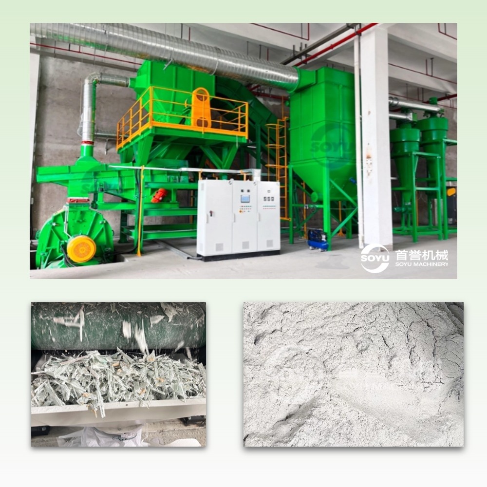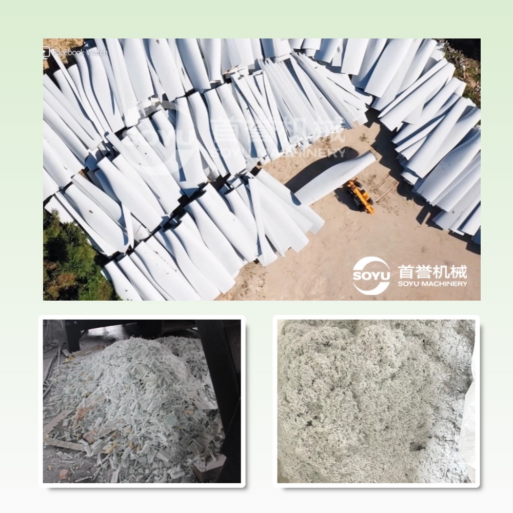 三、技術突破:智能化與精細化并行 1. 設備升級 -首譽機械研發的退役風電葉片玻璃鋼制品資源化處置系統等新型裝備,通過增加破碎維度,將出料粒度控制在 200目 以內,滿足高端復合材料再生需求。